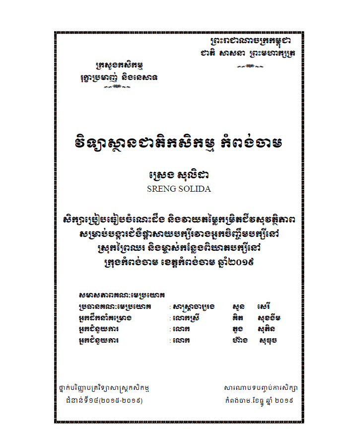 សិក្សាប្រៀបធៀបចំណេះដឹង និងវាយតម្លៃកម្រិតជីវសុវត្ថិភាពសម្រាប់បង្ការជំងឺផ្ដាសាយបក្សីរវាងអ្នកចិញ្ចឹមបក្សីនៅស្រុកព្រៃឈរ និងម្ចាស់កន្លែងពិឃាតបក្សីនៅក្រុងកំពង់ចាម